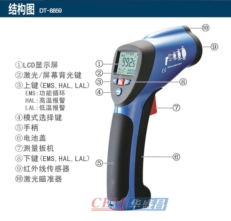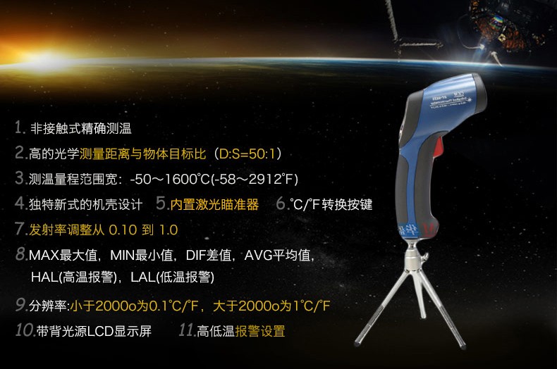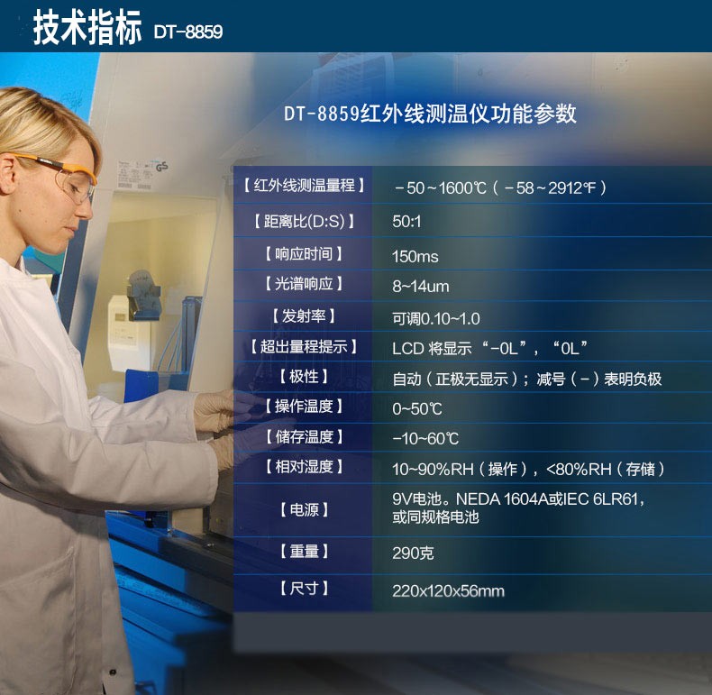 DT-8829紅外線測(cè)溫儀一種專業(yè)型的手持式非接觸紅外線測(cè)溫儀,使用簡(jiǎn)易,設(shè)計(jì)堅(jiān)實(shí),測(cè)量準(zhǔn)確度高,測(cè)溫量程范圍寬等特點(diǎn)。它具有激光瞄準(zhǔn),帶背光源顯示器,最大值,最小值,平均值,差值,數(shù)據(jù)保持,高低溫報(bào)警,發(fā)射率可調(diào)及自動(dòng)關(guān)機(jī)功能。該手持式非接觸紅外線測(cè)溫儀可用于測(cè)量那些不適合使用傳統(tǒng)接觸式測(cè)量方法來(lái)測(cè)量物體的表面溫度(例如移動(dòng)物體,帶電表面和難以接觸到的物體)。特征:非接觸式精確測(cè)溫高的光學(xué)測(cè)量距離與物體目標(biāo)比(D:S-16;1/50:1)測(cè)溫量程范圍寬獨(dú)特新式的機(jī)殼設(shè)計(jì)內(nèi)置激光瞄準(zhǔn)器自動(dòng)數(shù)值保持℃/F轉(zhuǎn)換按鍵發(fā)射率調(diào)整從0.10 到1.0,(8829固定在0.95)MAX,MIN,DIF,AVG 溫度顯示帶背光源LCD顯示屏自動(dòng)選擇量程,分辨率為0.1